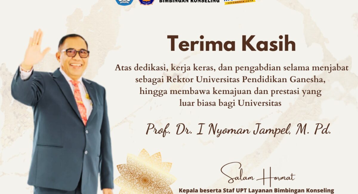 Terimakasih kepada Bapak Prof. Dr. I Nyoman Jampel, M.Pd. atas dedikasi, kerja keras, dan pengabdian selama menjabat sebagai Rektor Universitas Pendidikan Ganesha, hingga membawa kemajuan dan prestasi yang liuar biasa bagi Universitas.